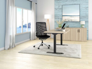 Includes iRize Straight Desk with Coastal Dune Top and Black Base, Rayne Credenza with Double Storage Cabinets, and a Gravity Conference Mesh Chair in Black.