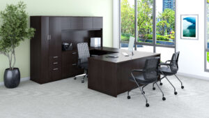 Includes Kai U-Shaped Desk with Box/Box/File and Lateral File in Espresso, Kai Hutch with Four Laminate Doors in Espresso, Kai Wardrobe in Espresso, Gravity Task Chair with Gray Mesh and Black Seat, and Switch Nesting Chairs.