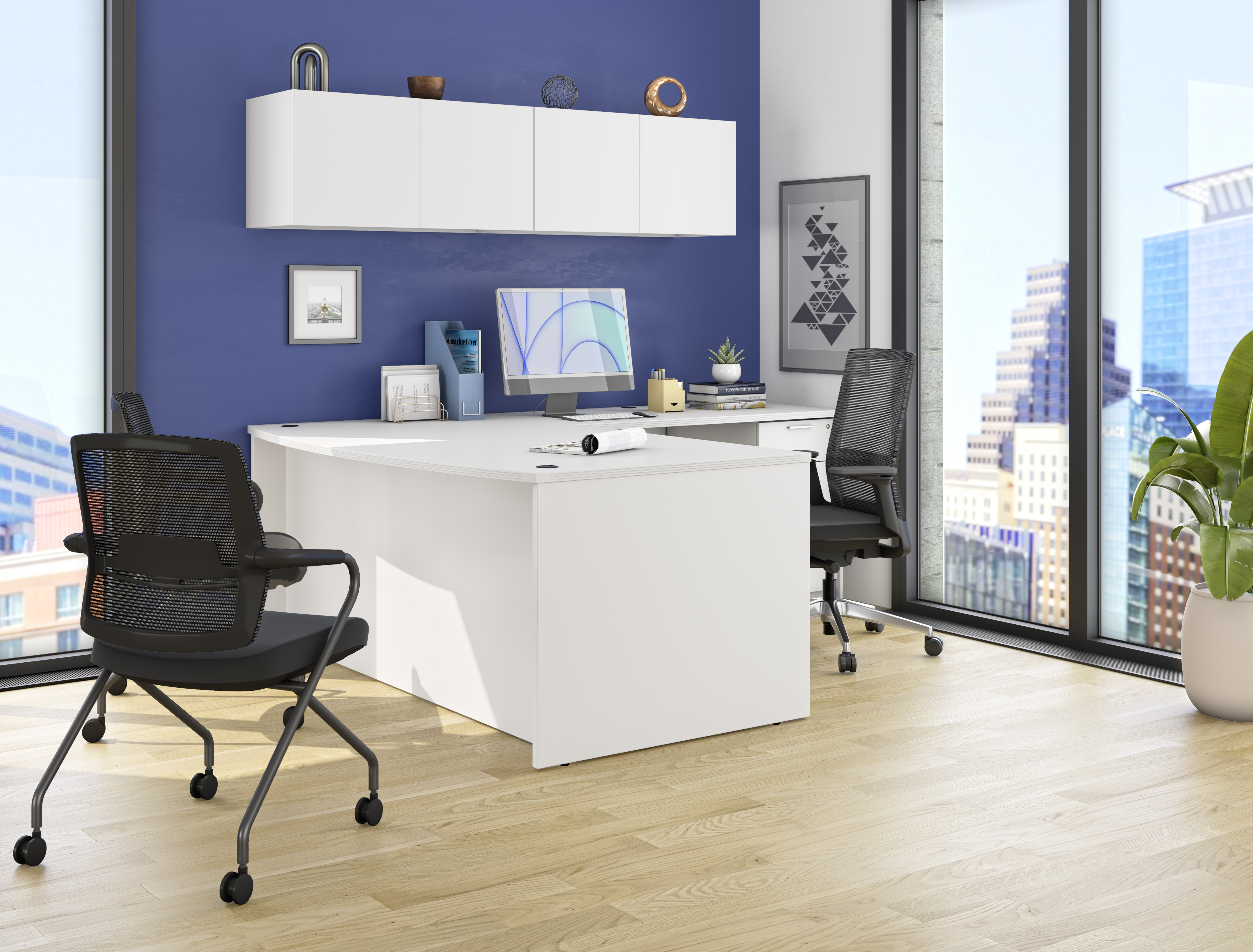 Includes Kai L-Shaped Bow Front Desk with Double Full Pedestals in Matte White, two Kai 36″ Wall Mounted Hutches with two Laminate Doors in Matte White, a Gravity Task Chair, and two Switch Nesting Chairs.