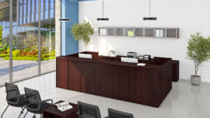Includes two Kai L-Shaped Reception Desks in Mahogany, four 36″ Wall Mounted Hutches with 2 Glass Doors, two Kai Credenzas with Double Lateral files, Kai end table, and four Switch nesting chairs.