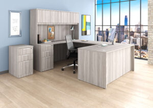 Includes Rayne U-Shaped Desk with Double Full Pedestals in Harbor Elm, Rayne Hutch with Four Laminate Doors in Harbor Elm, Rayne Box/Box/File Pedestal with Top, and Gravity Task Chair with Gray Mesh and Black Seat.