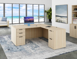 Includes L-Shaped Bow Front Desk with Double Full Pedestals in Coastal Dune and matching Open Hutch Storage Cabinet.