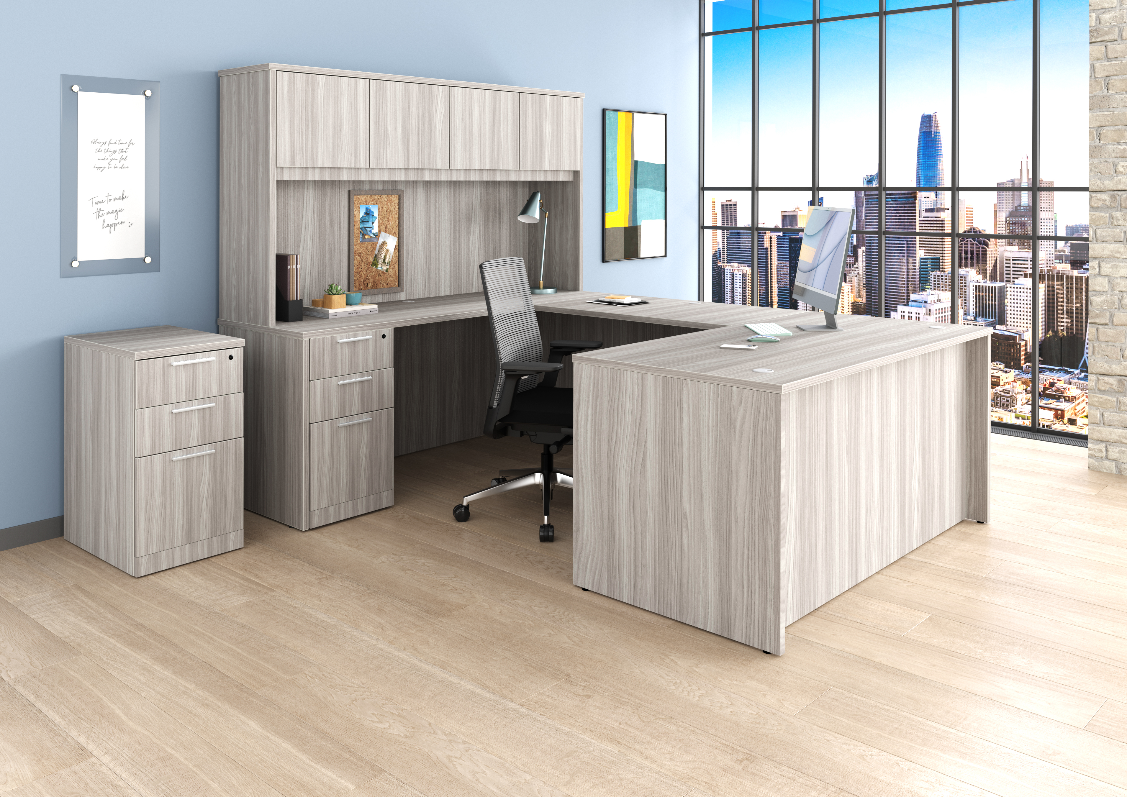 iRize Coastal Private Office in Harbor Elm with Rayne Storage + Nova Task Chair