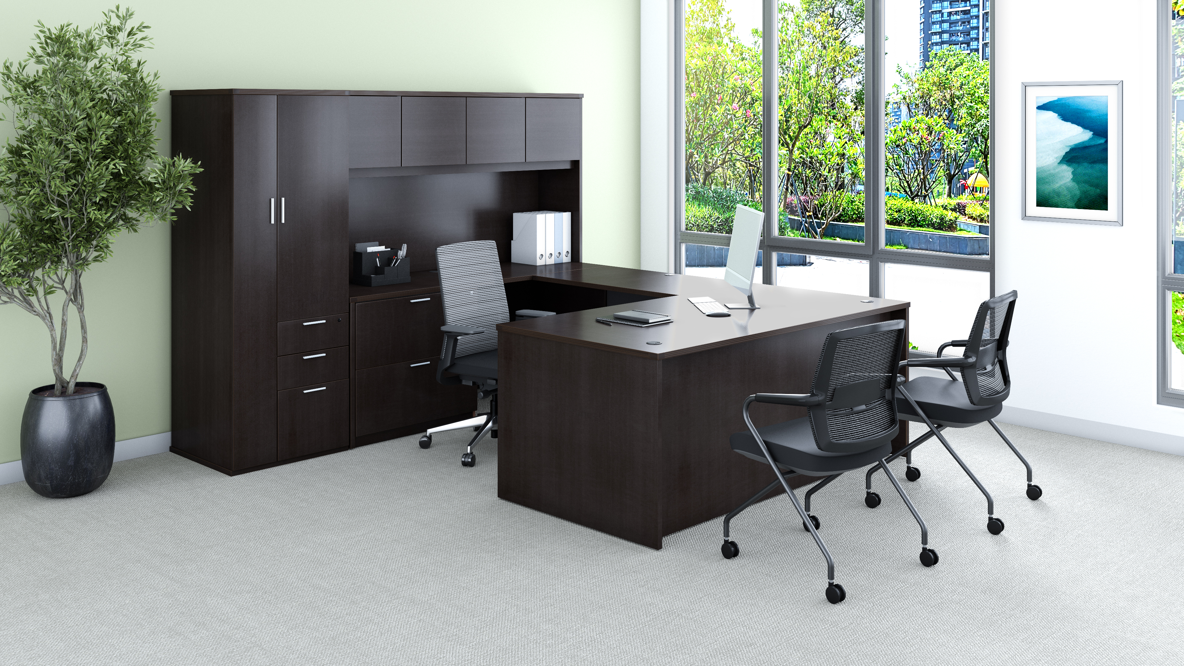 Kai Executive Office Ground Floor Urban Area in Espresso + Gravity Task Chair + Switch Nesting Chairs