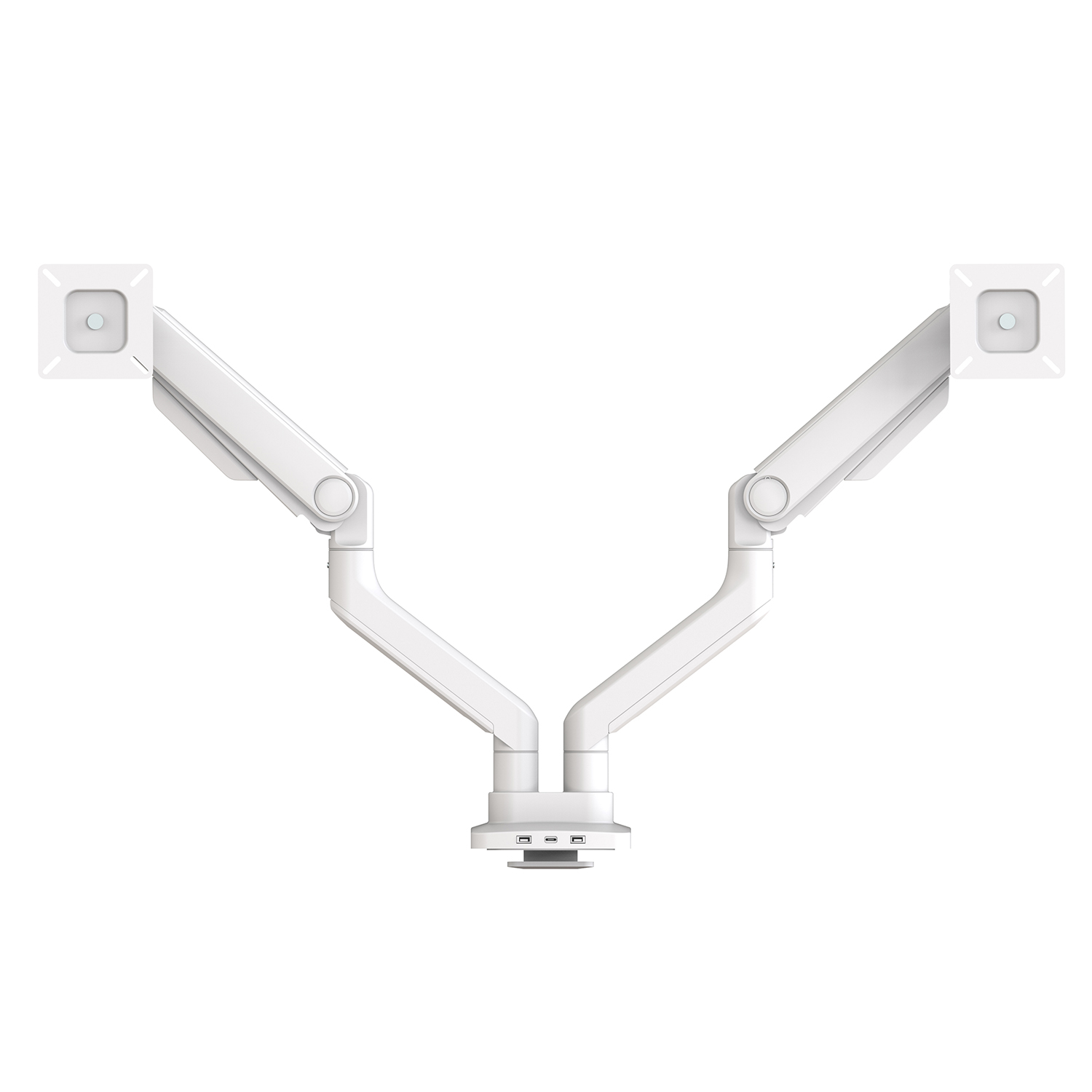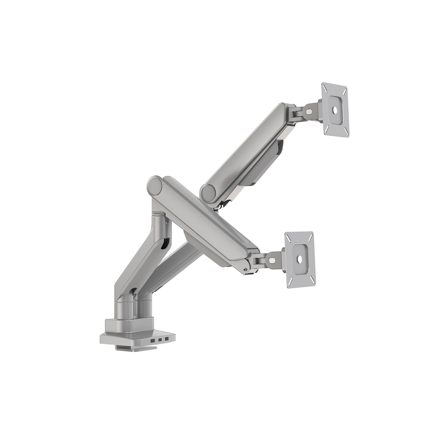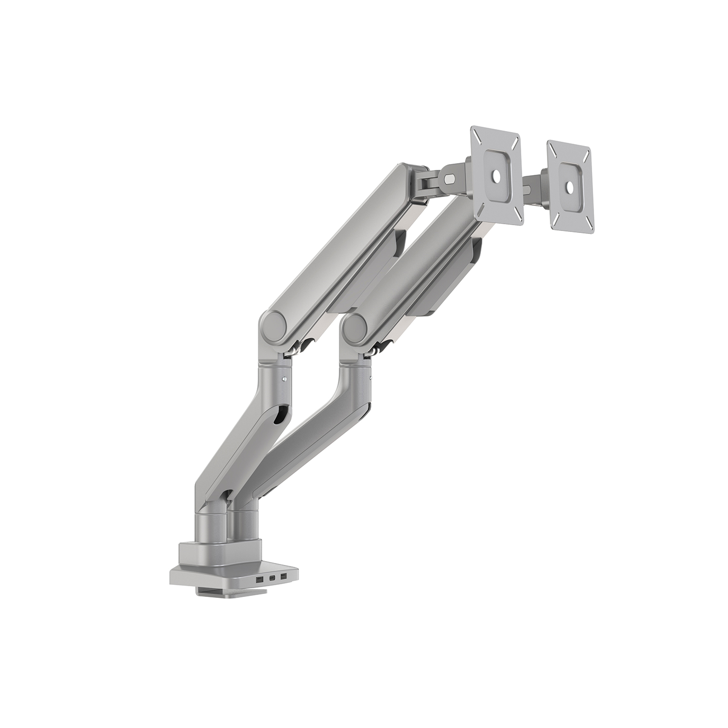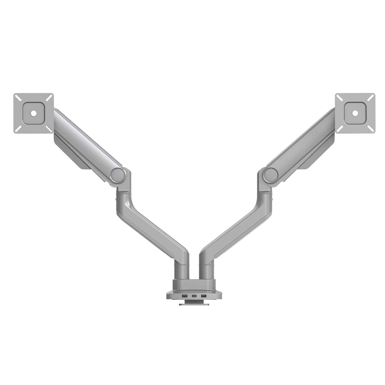 Array Duo is a Dual Monitor Arm with 2 USB-A ports and 1 USB-C port. Available in Black, Silver, or White powder coated finishes.