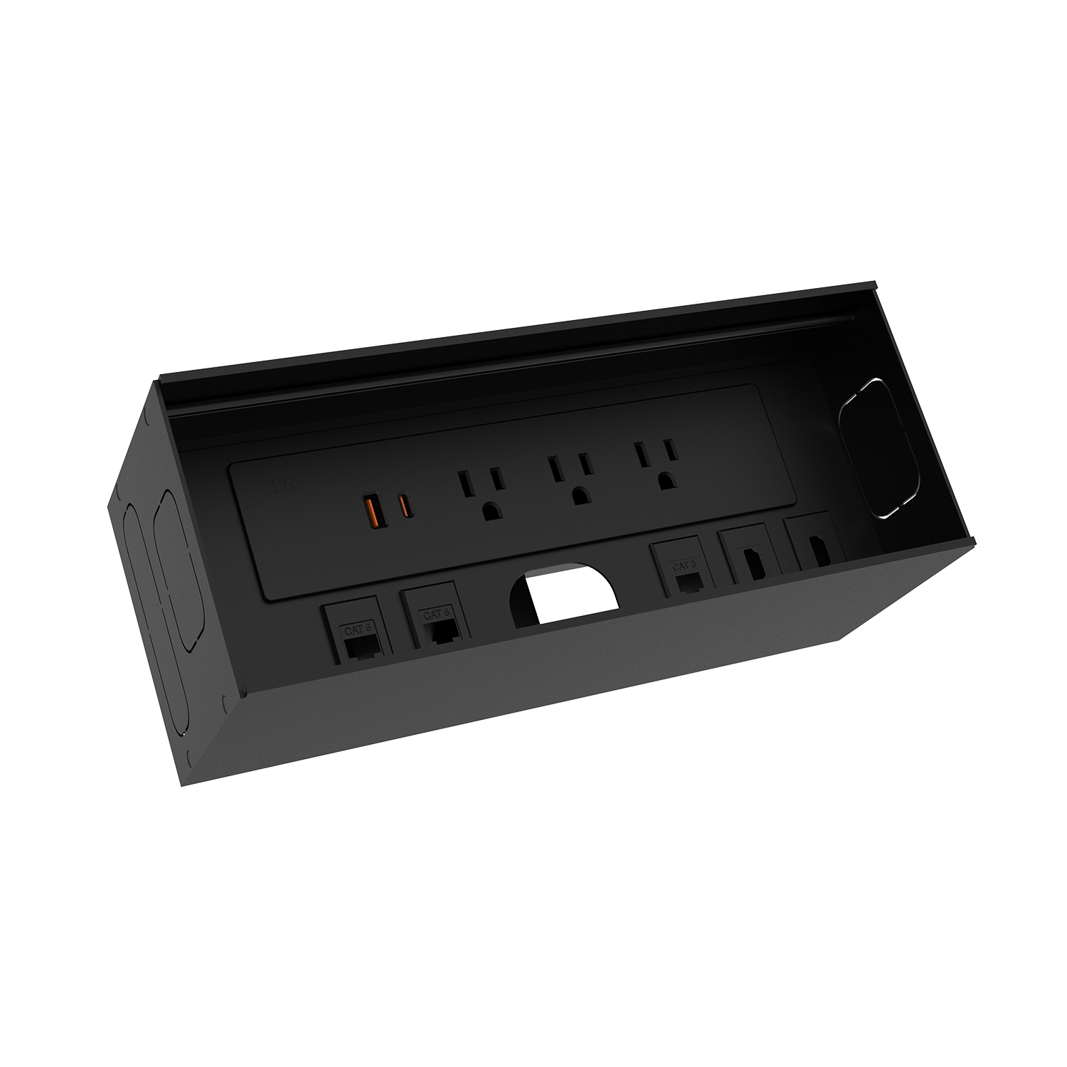 Conference Table Power Box with 3 AC Outlets, 1 USB-A Outlet, 1 USB-C Outlet, 2 CAT6 Outlets, 1 CAT3 Outlet, 2 HDMI Outlets. UL Listed.