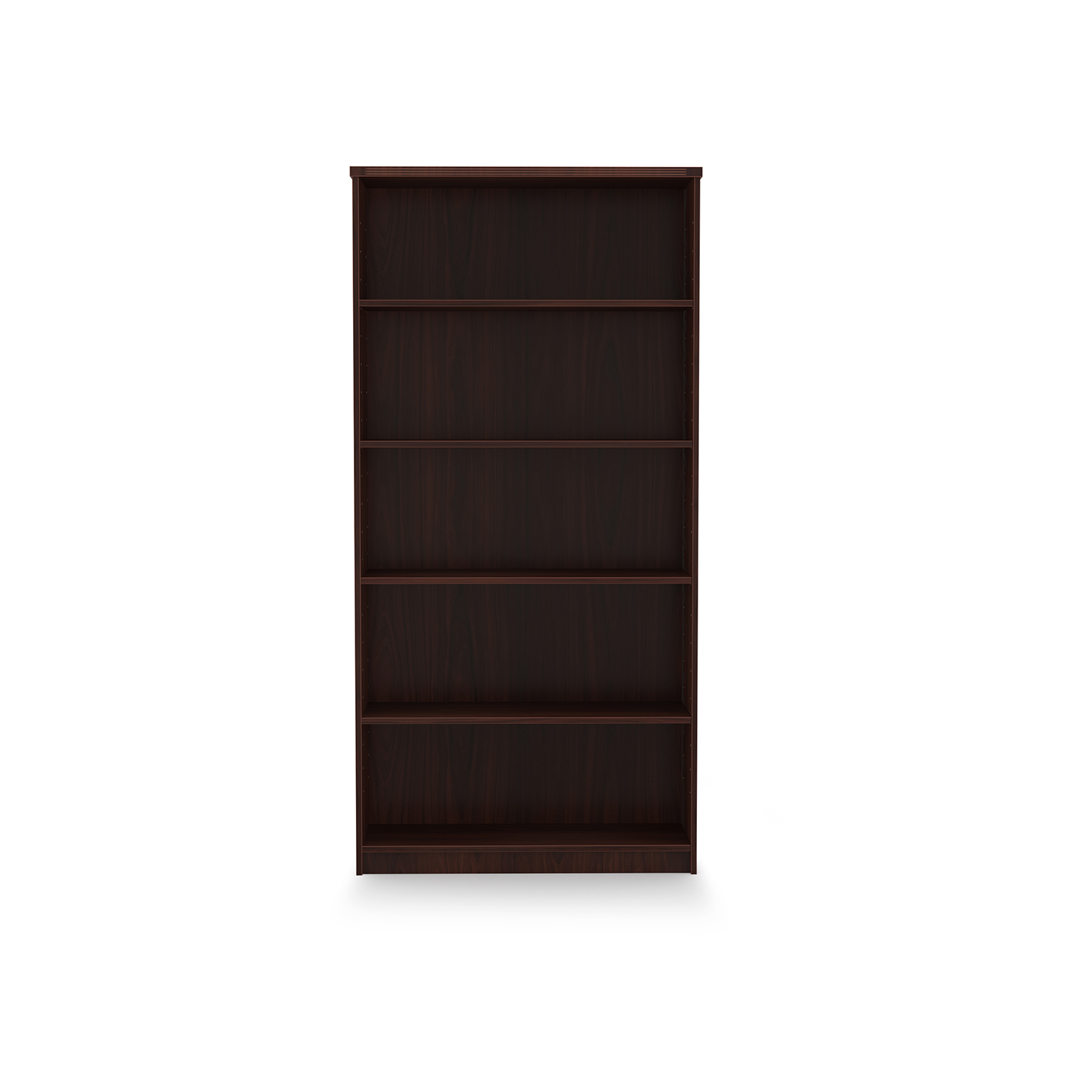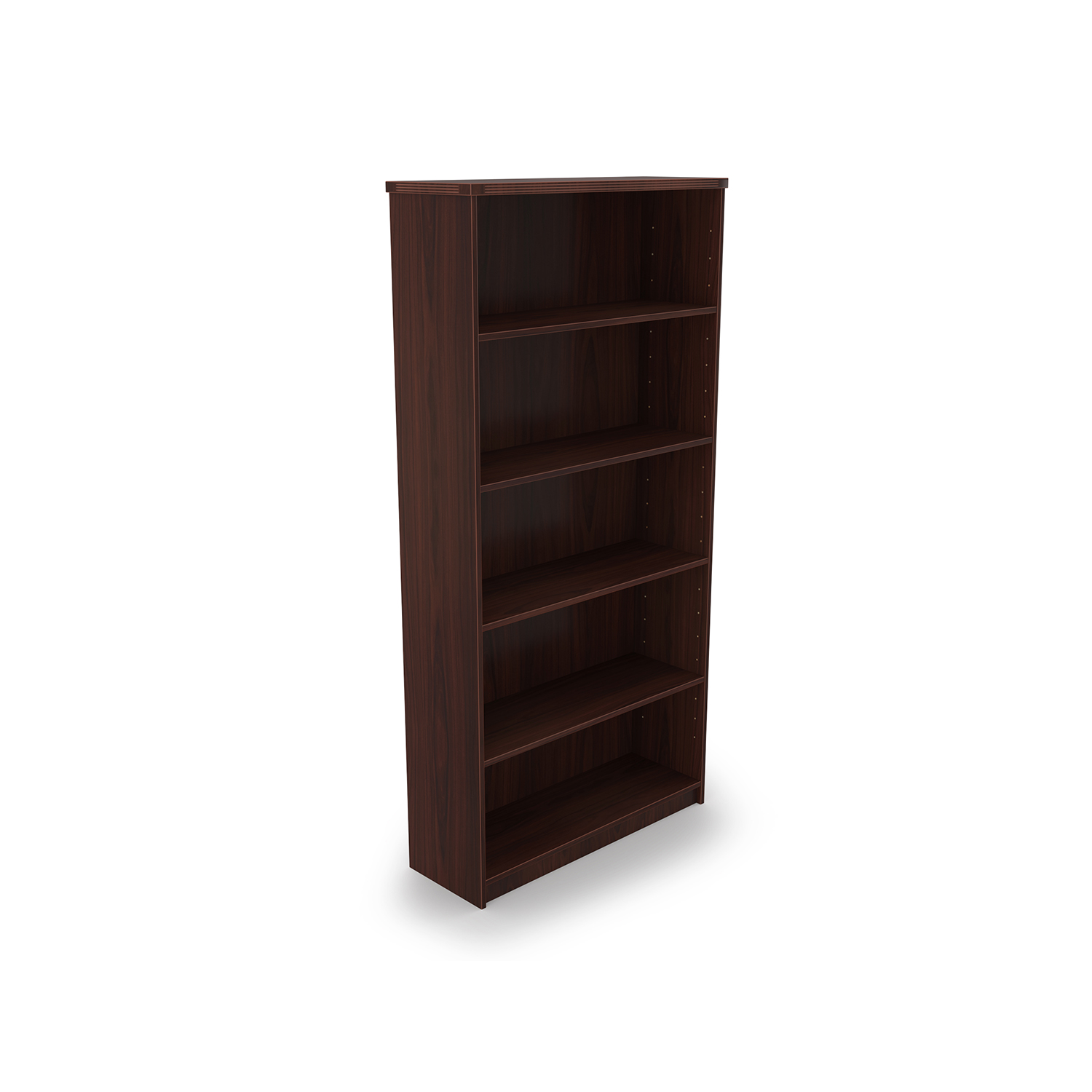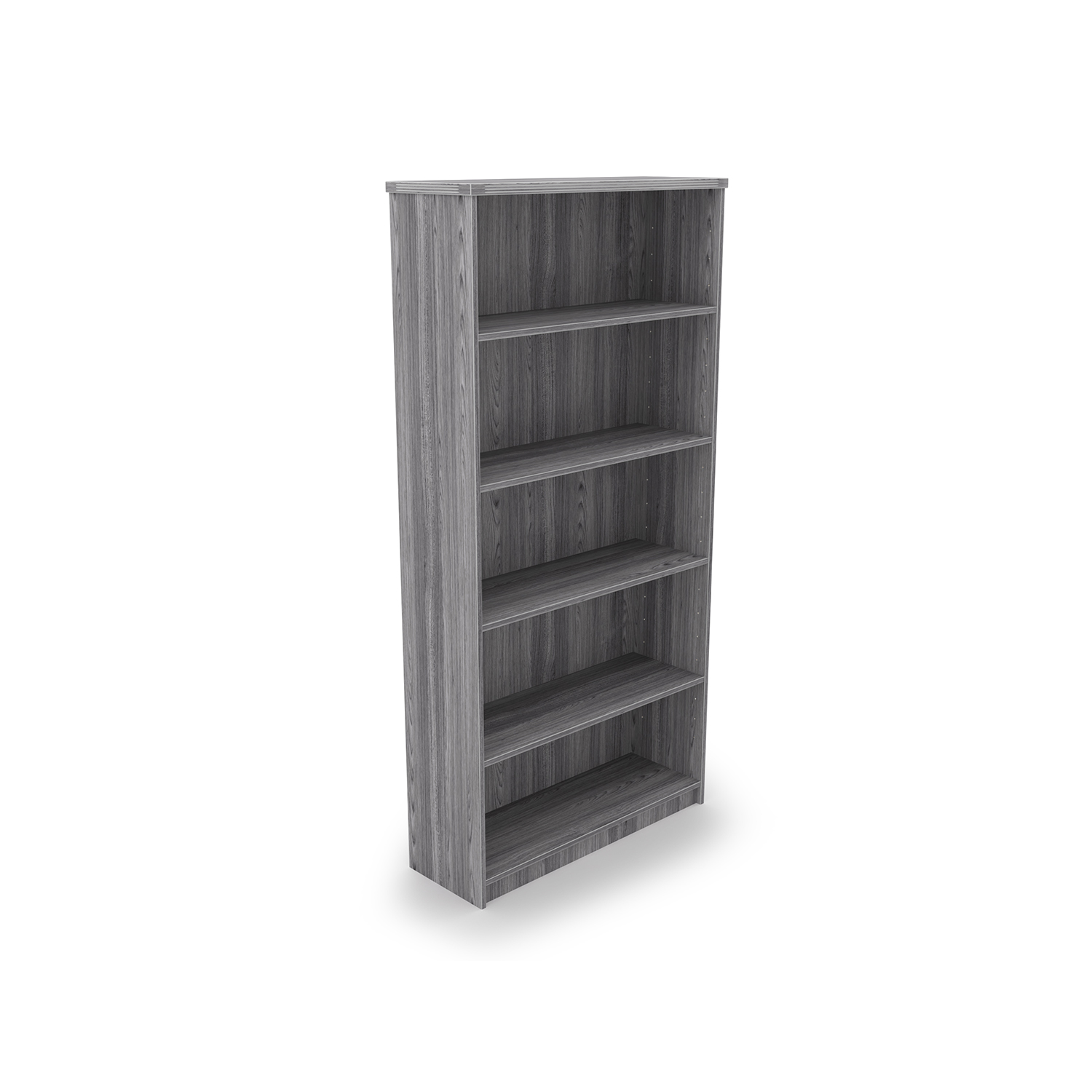 Kai Laminate Bookcase with 5 shelves with fluted top. Stands 5.75 feet tall. Contains 3 adjustable shelves. Available in 5 finish options.