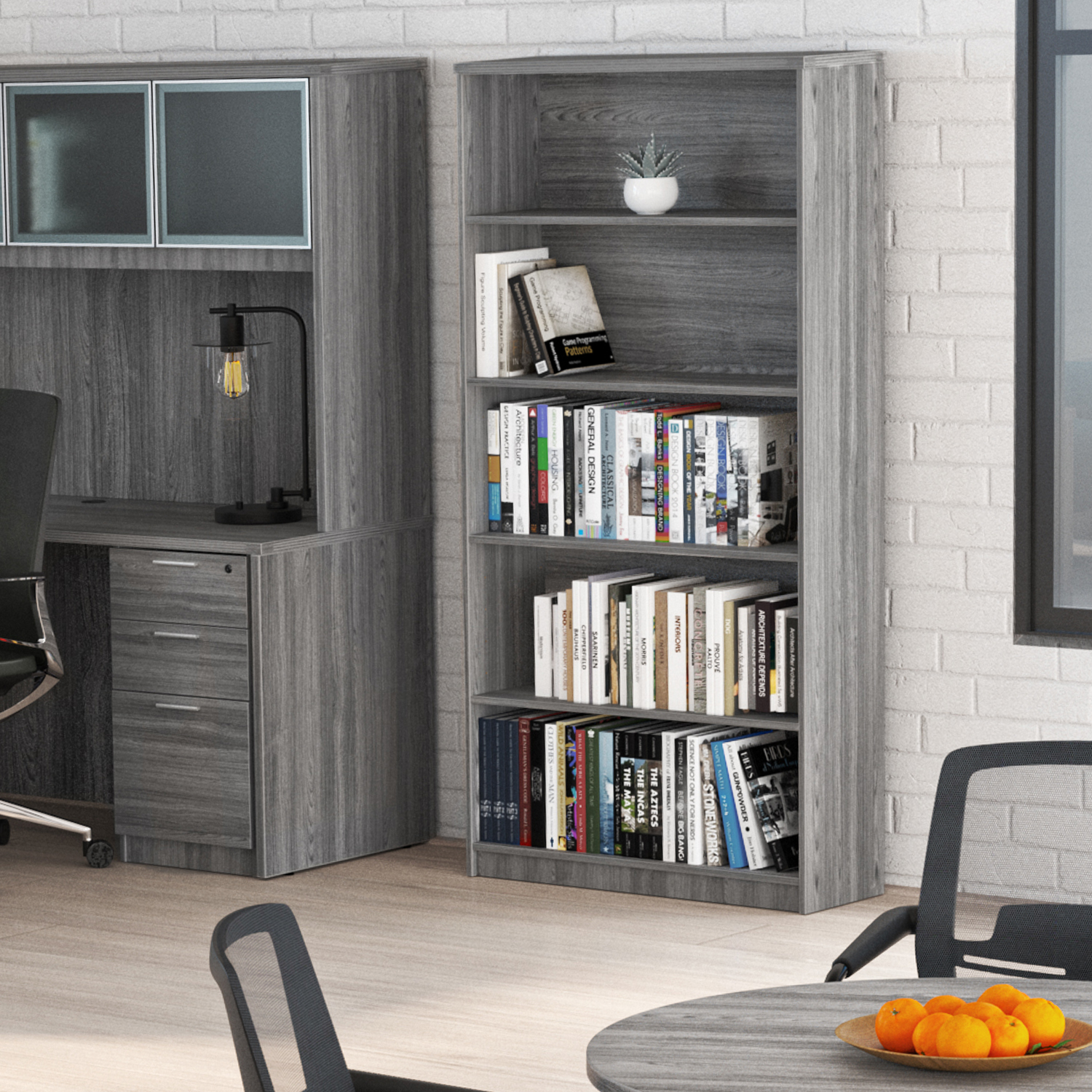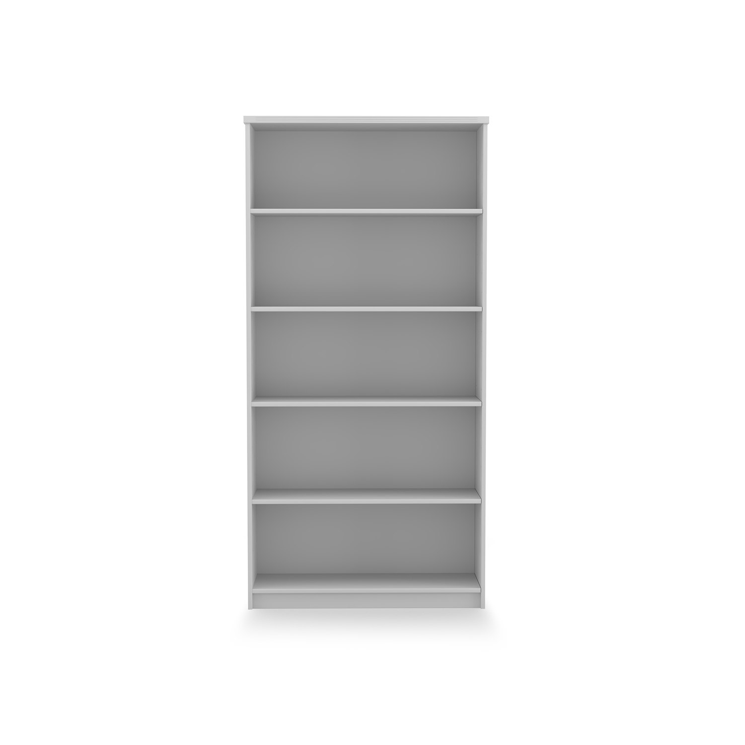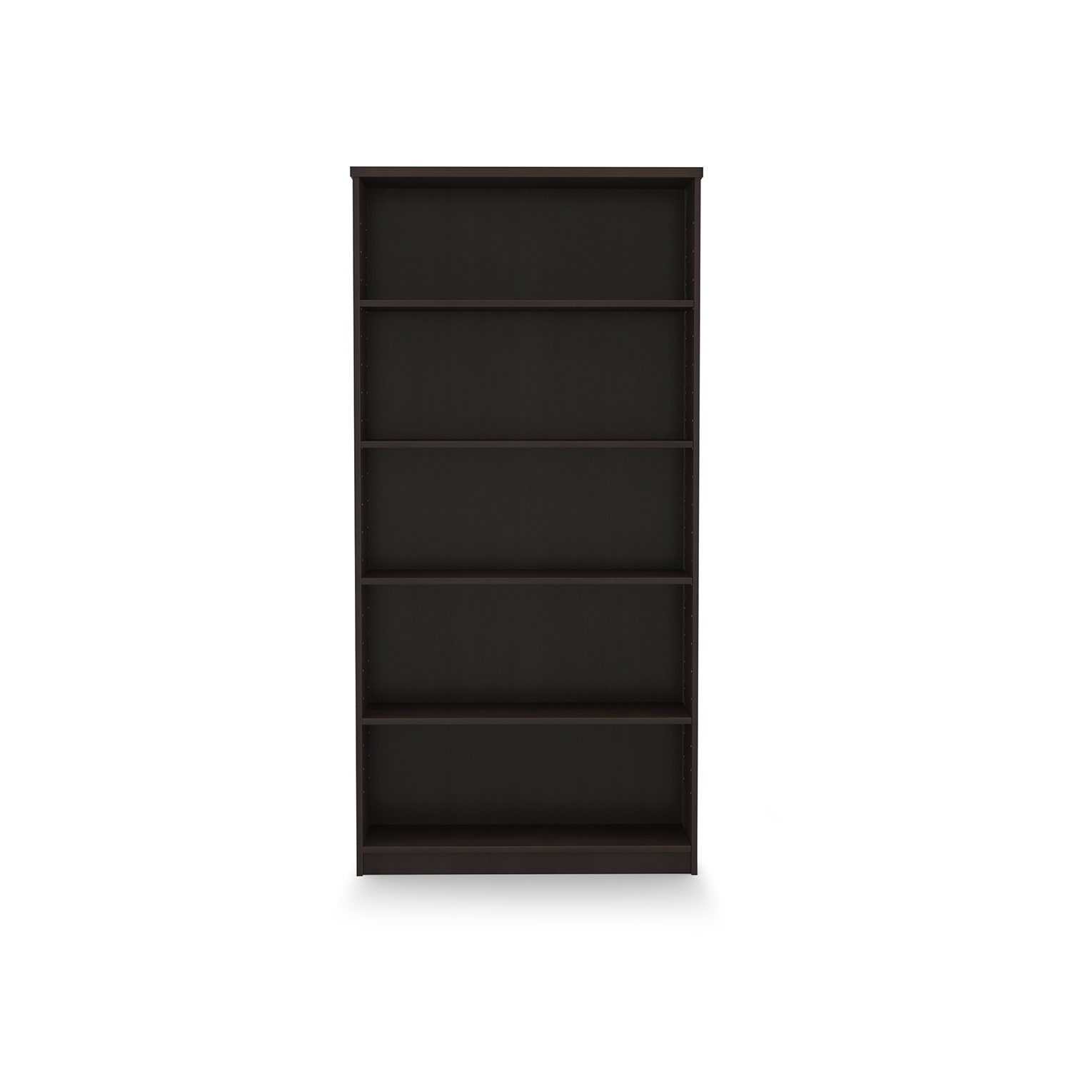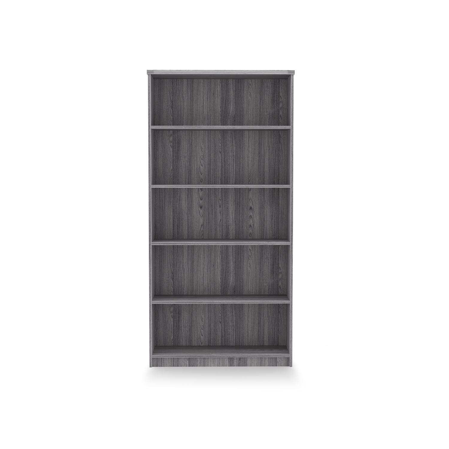 Kai Laminate Bookcase with 5 shelves with fluted top. Stands 5.75 feet tall. Contains 3 adjustable shelves. Available in 5 finish options.