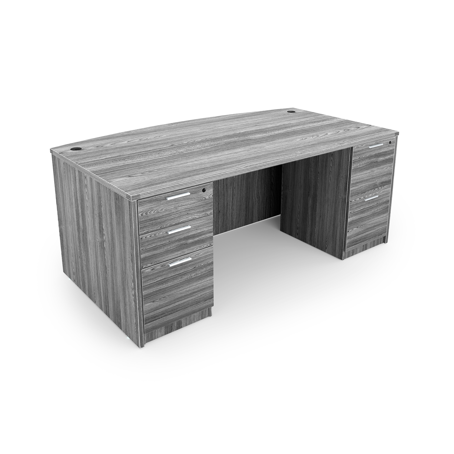 Kai Laminate Bow Front Desk Double Full Pedestals, 36″ x 71″ has five drawers, 2″ kick plates, and fluted edges. Available in five finishes.