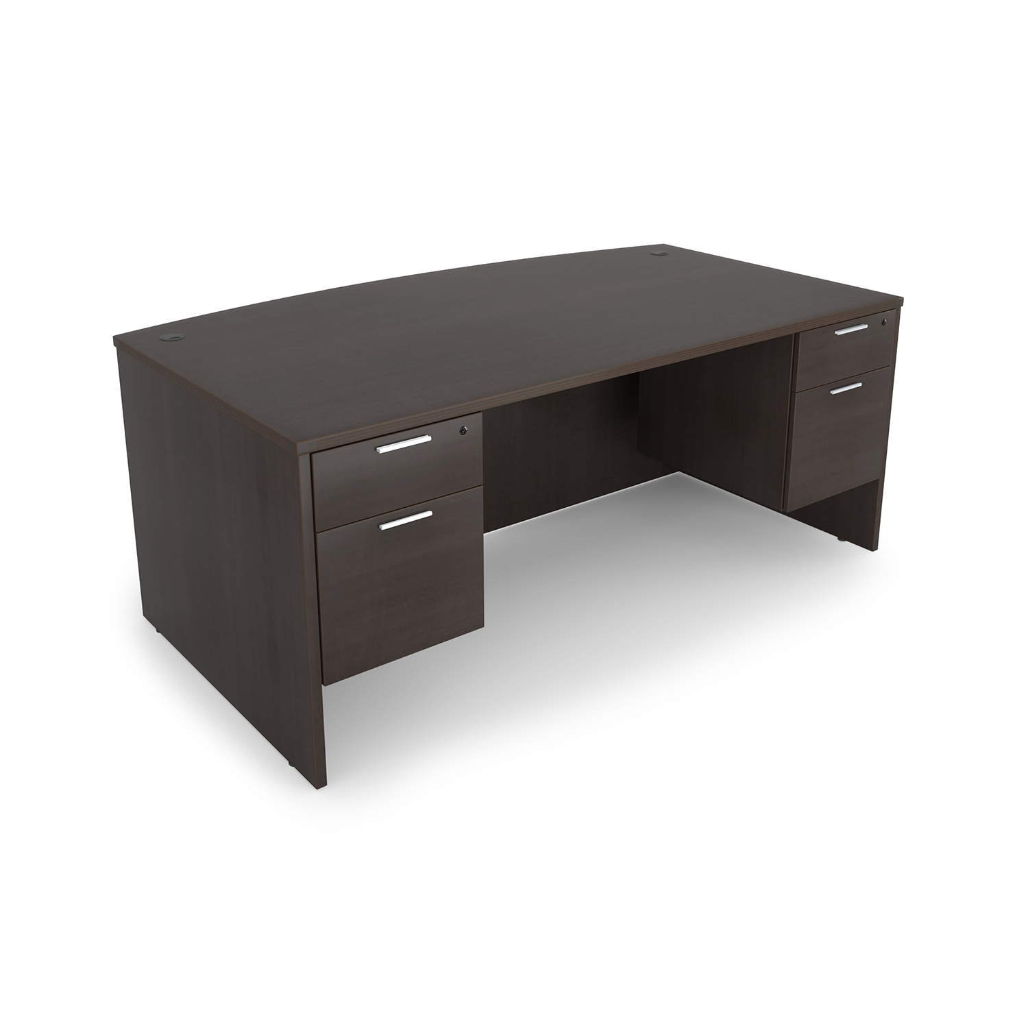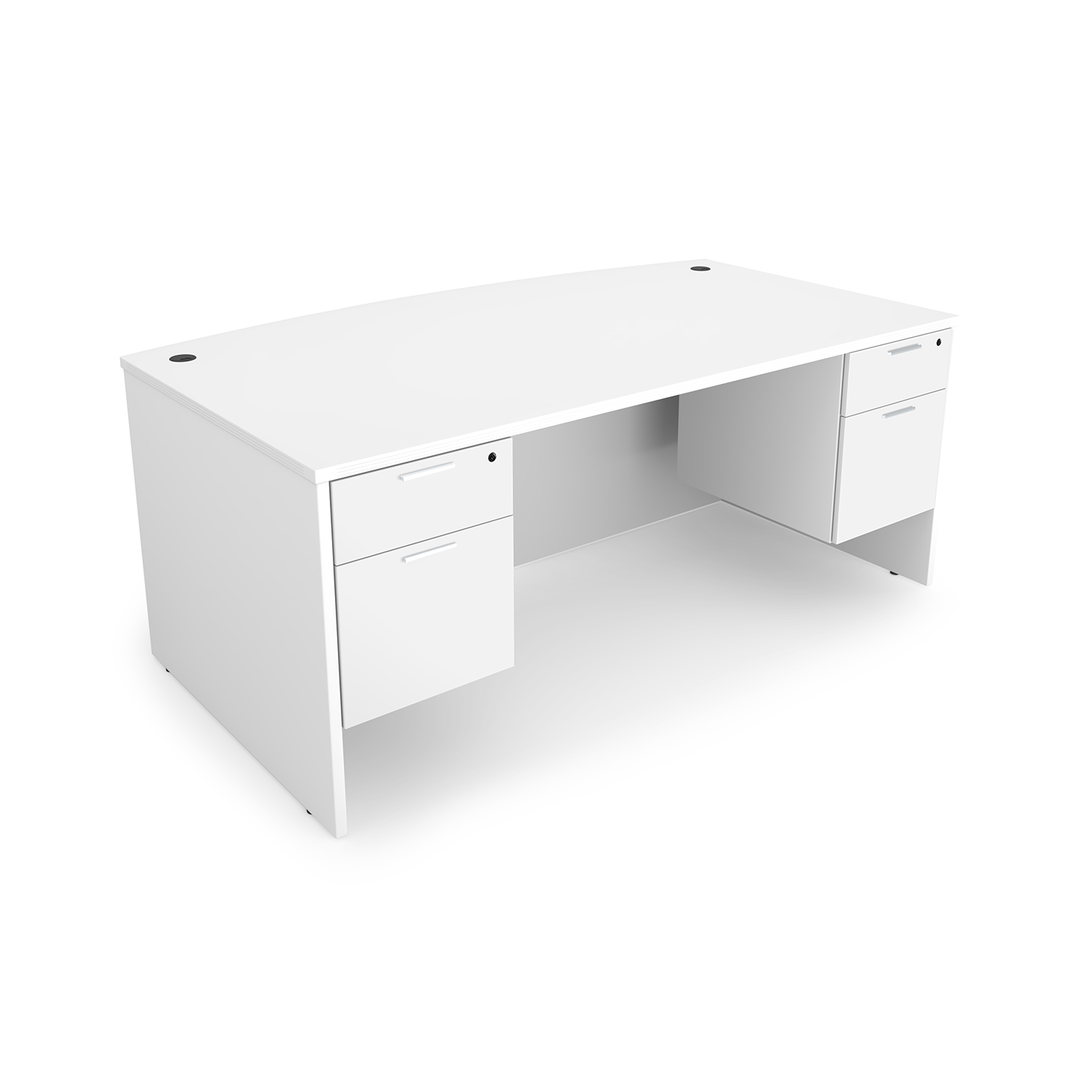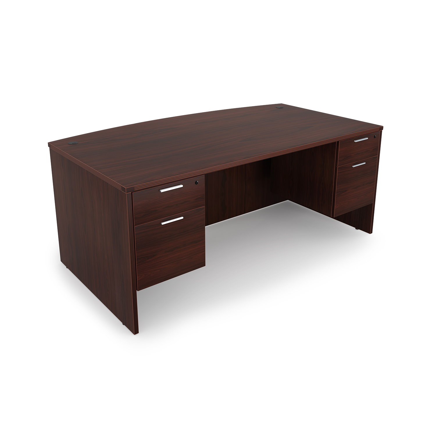 Kai Laminate Bow Front Desk Double Suspended Pedestals, 30″ x 71″ has four hanging drawers and fluted edges. Available in five finish options.