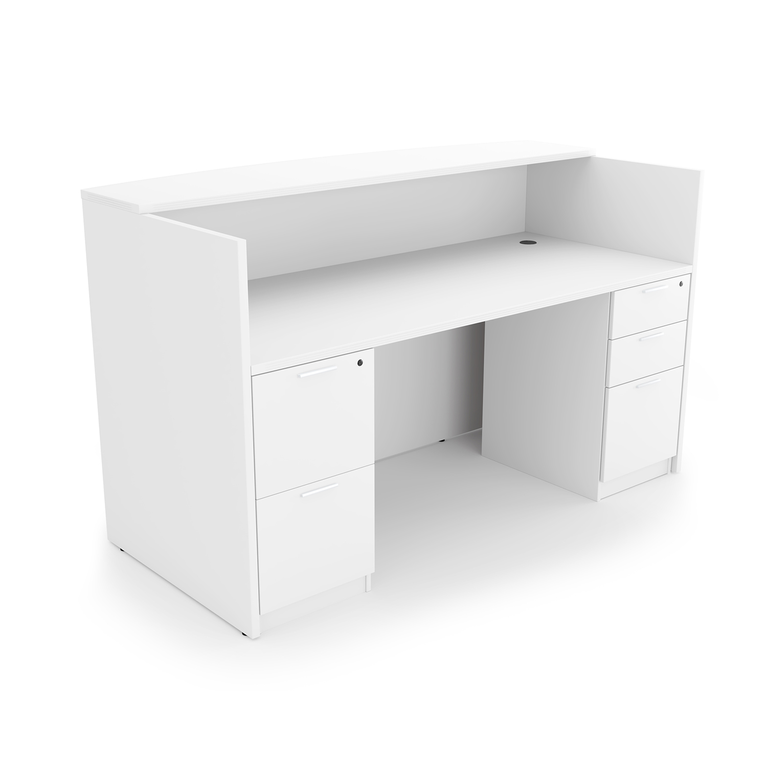 Kai Laminate Reception Desk with Double Full Pedestals, 30″ x 71″ has five drawers, 2″ kickplates, and fluted edges. Five finishes.