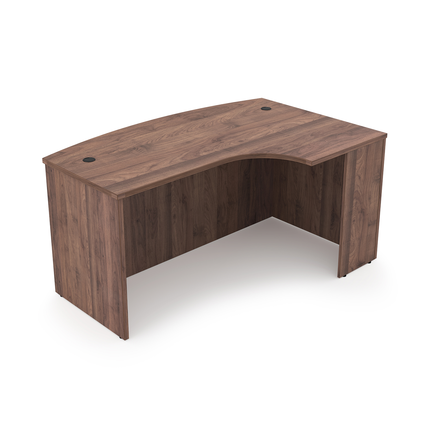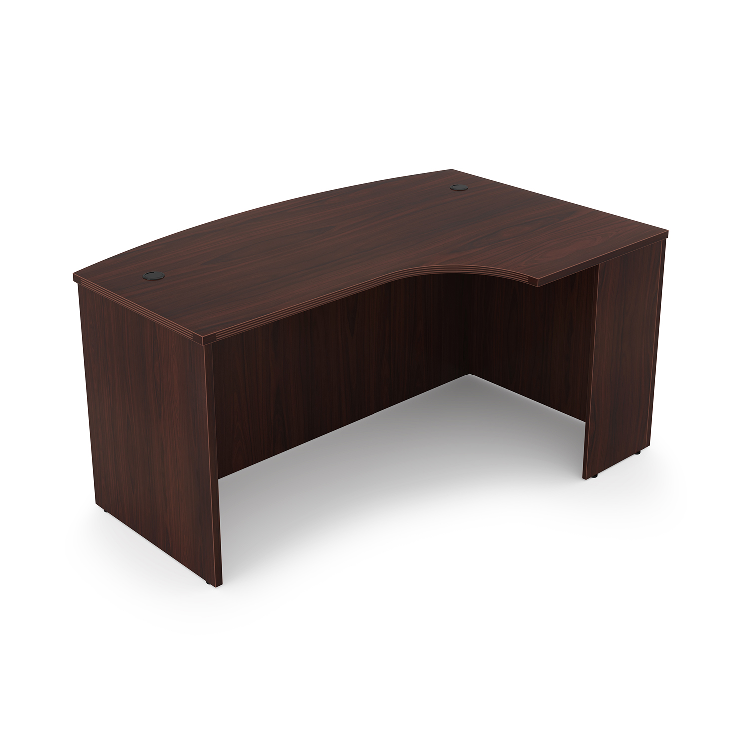 Kai laminate extended corner bow front shell to be used standalone or with under desk storage. Measures 41″ at its deepest point and 71″ long with a full height modesty. Right-handed version.