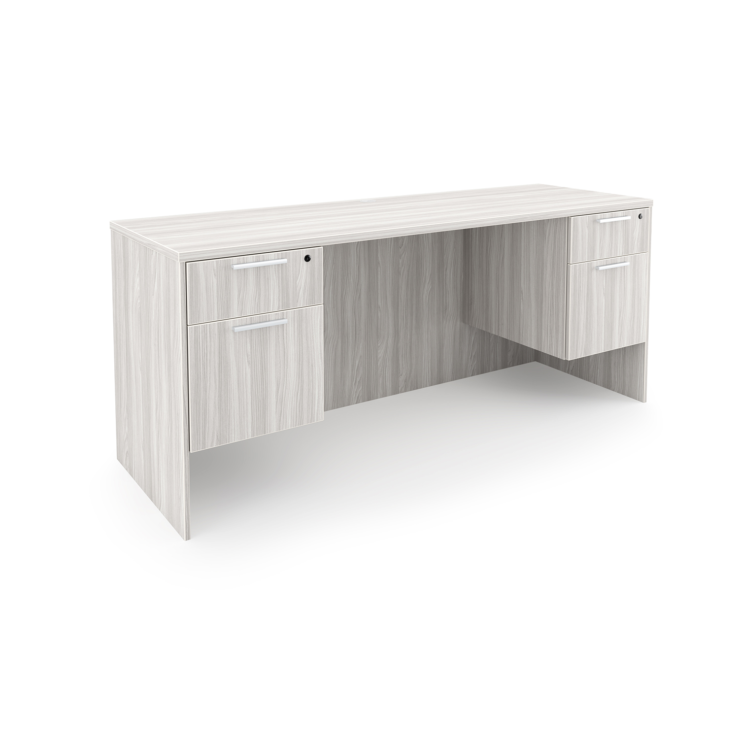 Rayne Laminate Credenza with Double Suspended Pedestals, 24″ x 66″ has four hanging drawers and flat edges. Available in two finish options.