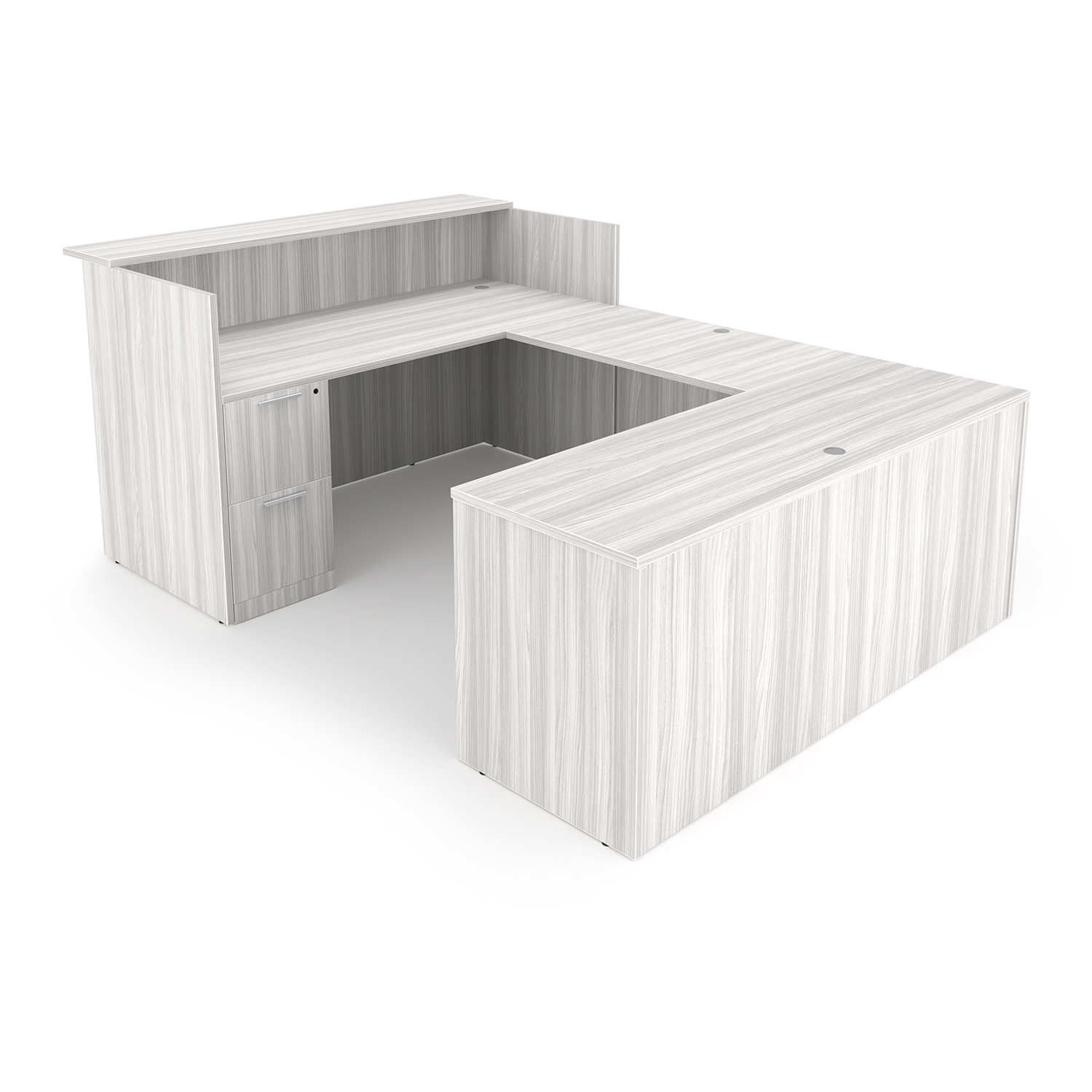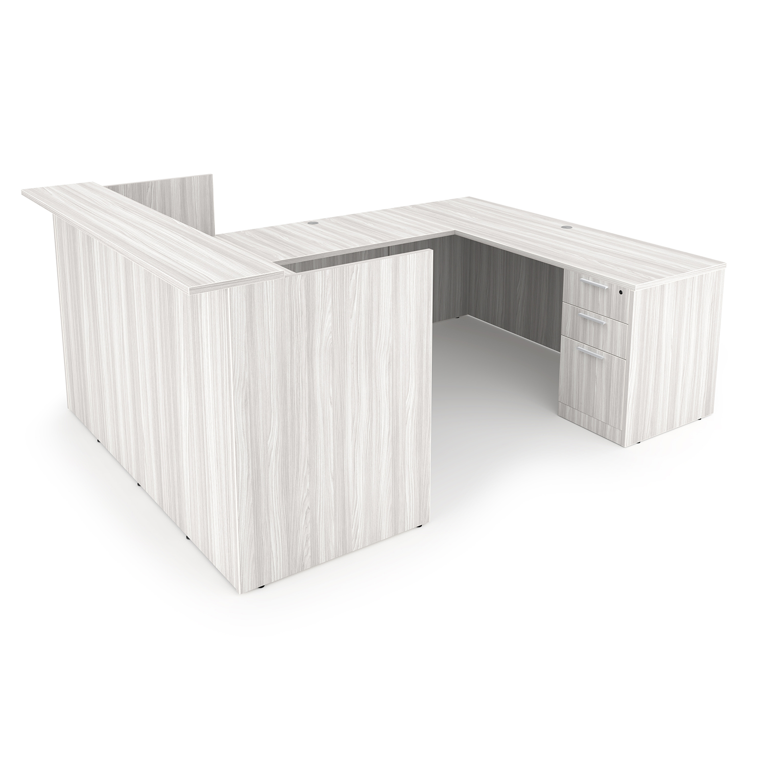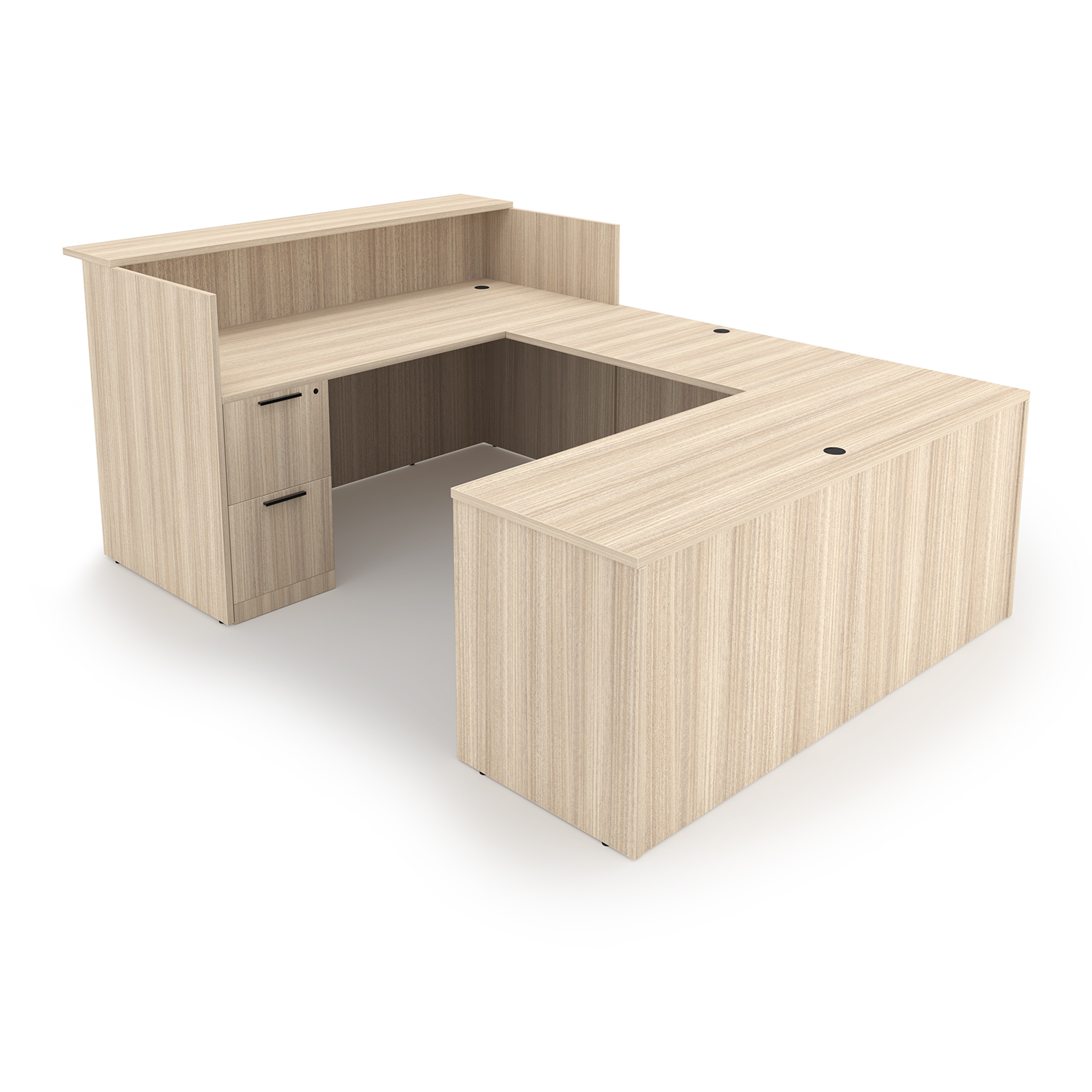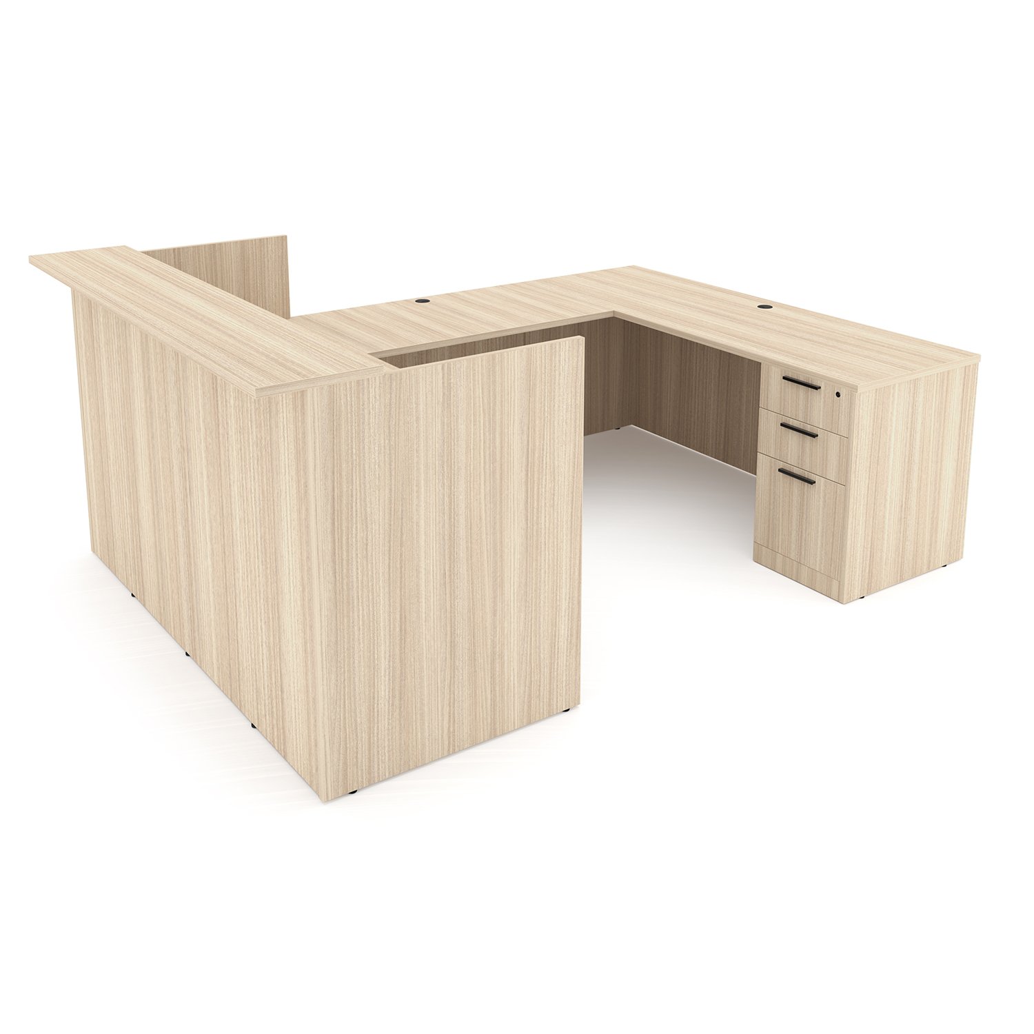 Rayne Laminate Reception U-Desk with Double Full Pedestals, 71″ x 96″ has five drawers, modern kickplates, and flat edges. Two finishes.