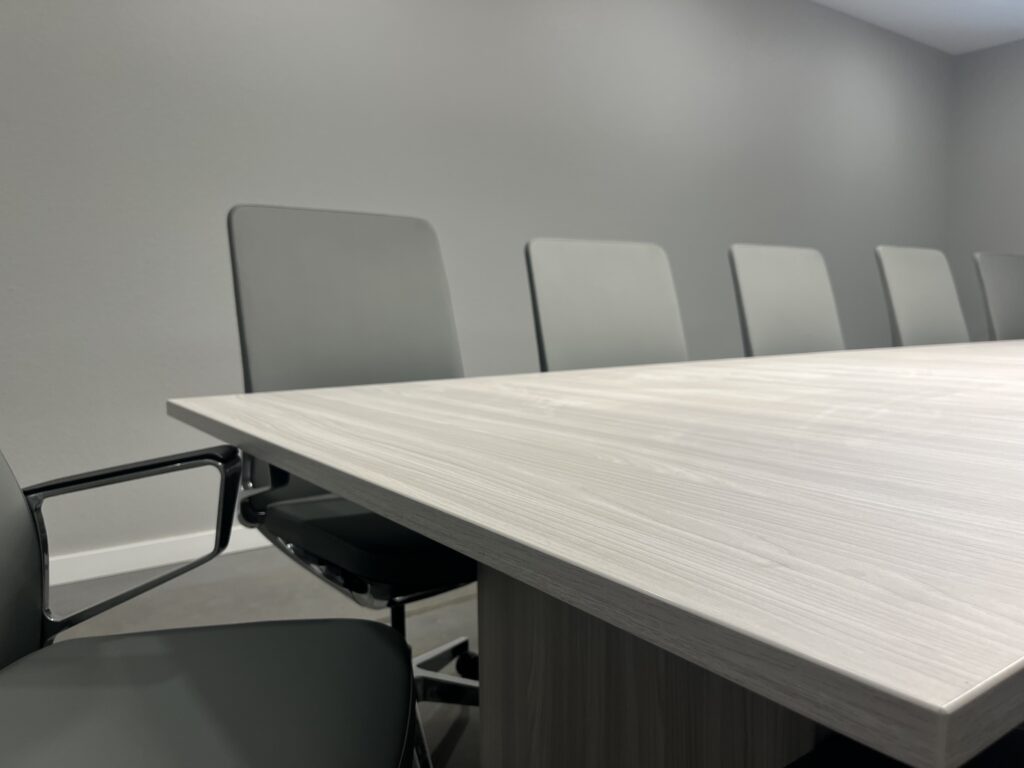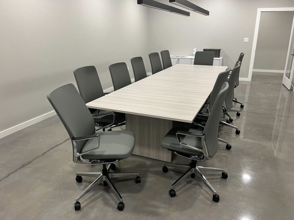 Products Shown: Rayne Conference Table, 144″ in Harbor Elm, Gravity Conference Chair in Smoke Gray Leather